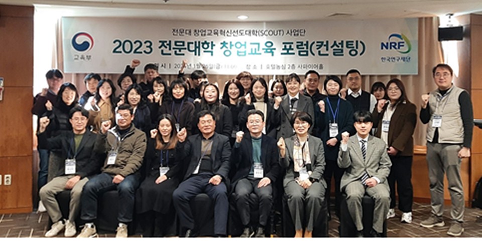 지난 26일 부산 농심호텔에서 권역별 스카우트 사업 주관대학 3개교가 진행한 '2023 전문대학 창업 교육 포럼'에 참석한 각 대학 관계자들이 기념사진을 촬영했다.(사진=울산과학대)
